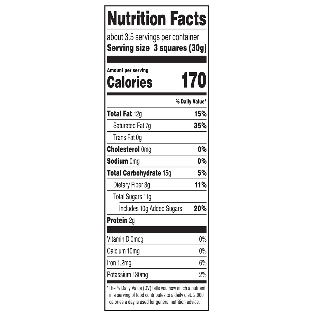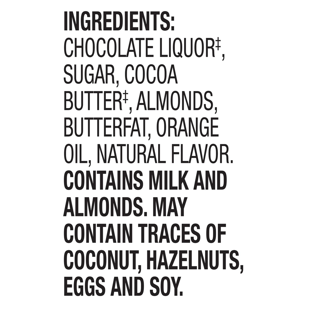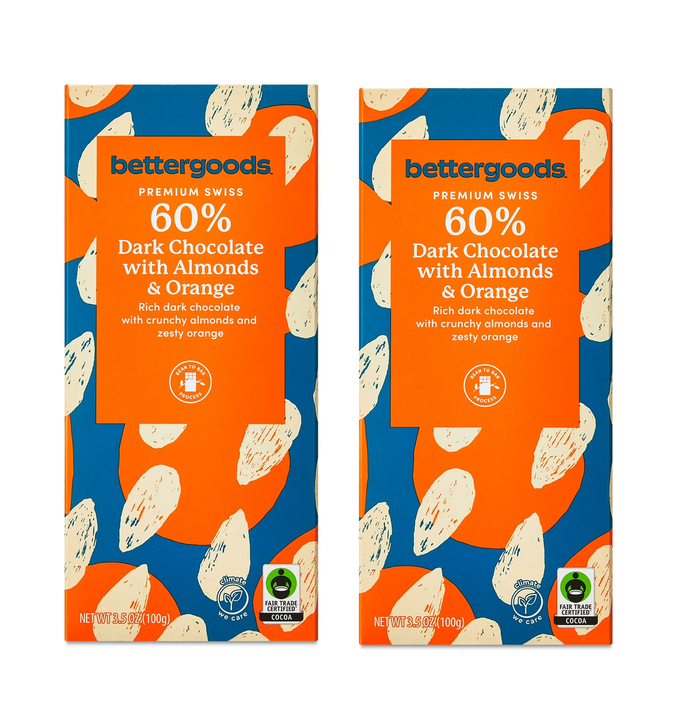About this item bettergoods Premium Dark Chocolate with Almonds & Orange Bar, 3 3.5oz, 2 Bars Rich and full-bodied dark chocolate Crafted in Switzerland using sustainably sourced cocoa beans from Ecuador and Ghana Fair trade certified Bean to bar process 3.5 servings per bar 180 calories per serving MAY CONTAIN...