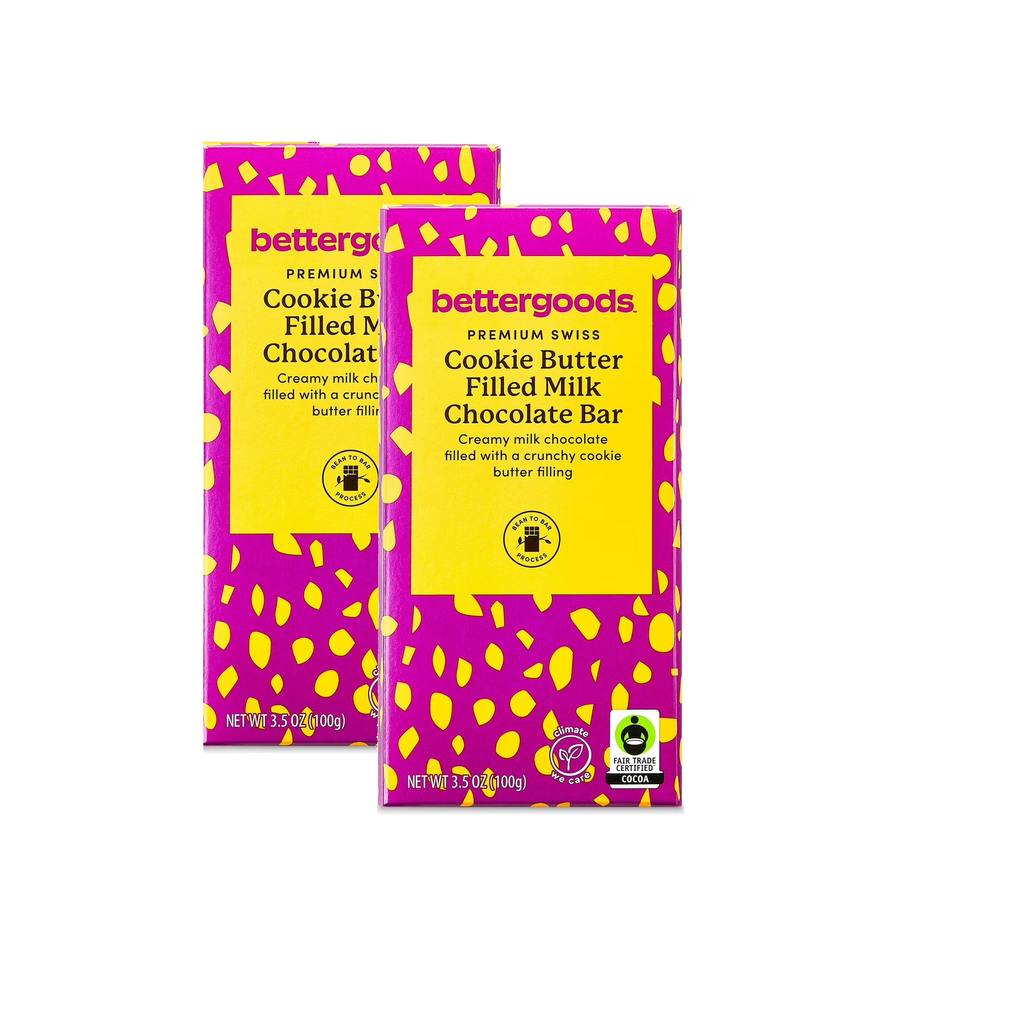 About this item bettergoods Premium Swiss Cookie Butter Filled Milk Chocolate Bar, 3.5 oz Creamy milk chocolate filled with a crunchy cookie butter filling Crafted in Switzerland using sustainably sourced cocoa beans from Ecuador and Ghana Fair trade certified Bean to bar process 3.5 servings per bar 170 calories per...
