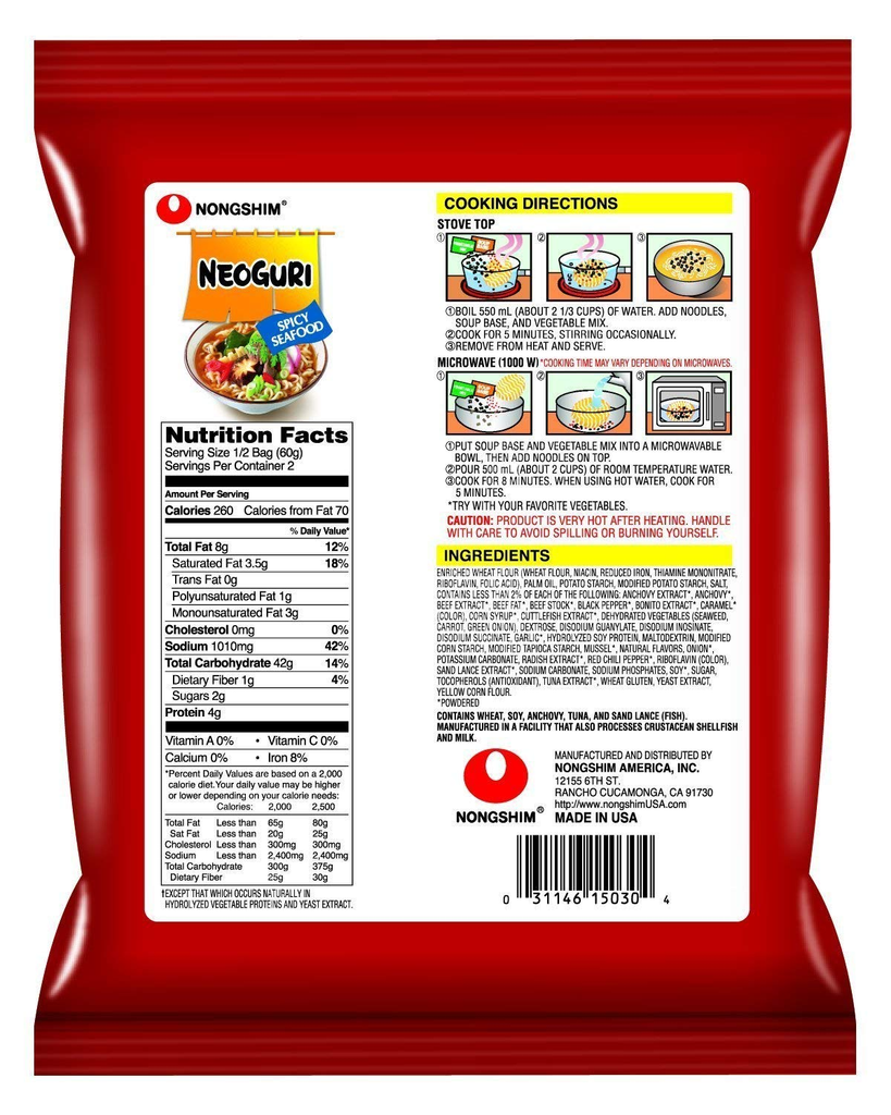 Product Description Product Description Sometimes, you need a great seafood soup but chowder is too dense and creamy. The perfect convenient alternative is the Nongshim Neoguri Spicy Seafood Flavor with udon-style noodles. It’s a bold and hearty dish, suited perfectly for enjoying at home with a snuggly sweater and a...